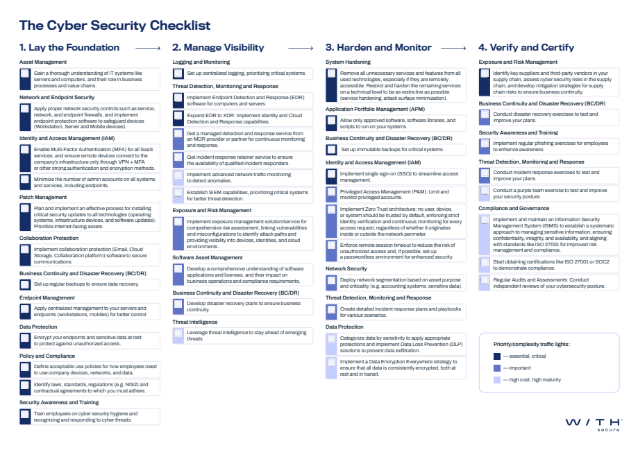 WithSecure presents a comprehensive checklist, developed through collaboration with experts from multiple fields. This unique list provides a broad and unparalleled perspective on cyber security, organizing tasks by both priority and complexity. The checklist is specifically designed to help organizations protect their environments.